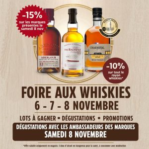 24 octobre 2025 | L'équipe de Cave Bruant Promotions exceptionnelles sur le whisky La Cave Bruant vous accueille pour sa Foire aux Whiskies 2025, du 6 au 8 novembre à Ormes. Trois jours sous le signe du whisky pour tous les amateurs : dégustations, promotions exclusives et rencontres avec les Brand Ambassadors. Profitez de nos offres spéciales pendant la foire : 15% sur une sélection exclusive de whiskies 10% sur le reste du rayon whisky offre disponible uniquement en magasin Rencontre avec les Brand Ambassadors Le samedi 8 novembre, venez échanger avec les Brand Ambassadors et découvrir vos whiskies préférés : Charmeval by Bruant, Port Charlotte Scapa The Balvenie, The Glenlivet Glenfiddich. Aberlour C’est une occasion unique pour déguster des whiskies rares et obtenir des conseils d’experts. Rendez-vous à la Cave Bruant située au 21 rue nationale, 45140 Ormes Horaires d’ouvertures : Du Mardi au Vendredi : 09h-12h & 14h-19h Le Samedi : 09h-19h Profitez également de la remise de -15% sur une sélection de whiskies sur notre boutique en ligne : www.cave-bruant.fr